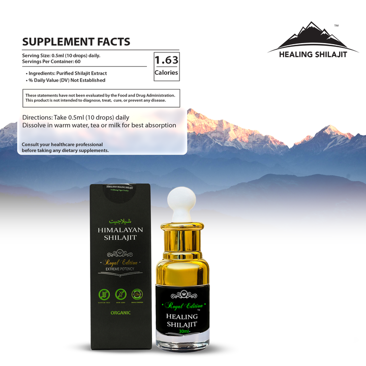 Himalayan Healing Shilajit is a naturally potent resin, packed with over 85 essential trace minerals and fulvic acid to boost your energy, vitality, and overall balance. Harvested by hand from the pristine heights of the Himalayas, purified naturally by glacier waters, and meticulously lab-tested for purity and safety, our Shilajit is sun-dried and crafted without intermediaries. It blends effortlessly into water, tea, or your favorite daily health routine.